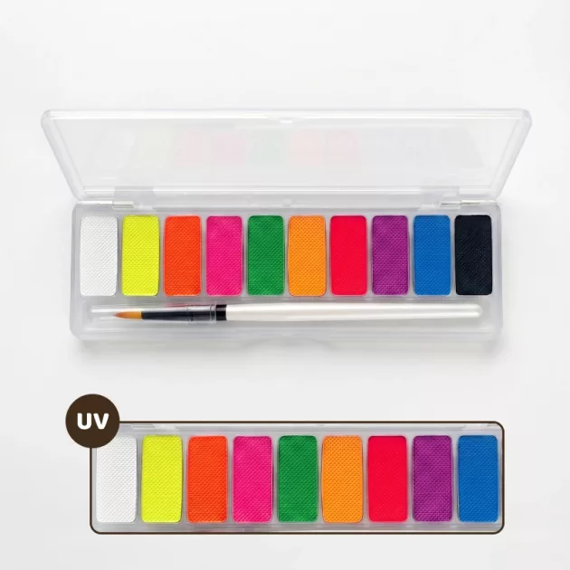 Deze verfwset gekocht voor de glow party van mijn dochter. De kleuren sprongen eruit onder de uv-lampen en waren daarna gemakkelijk af te vegen met een nat doekje.