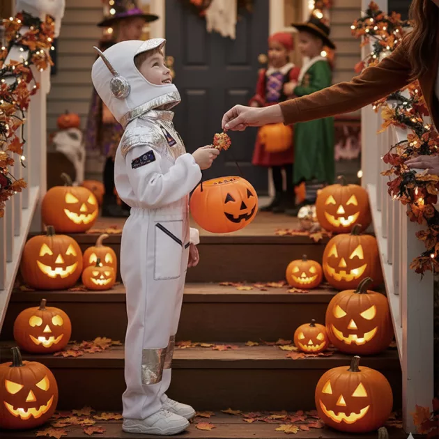 Onze familiefoto is geweldig met mijn kind verkleed als astronaut! De glinsterende details maakten het superleuk voor Halloween.
