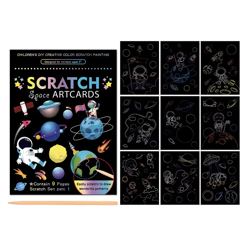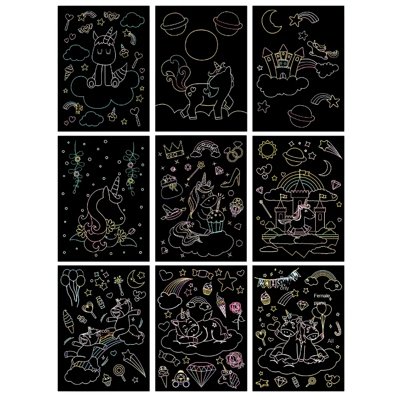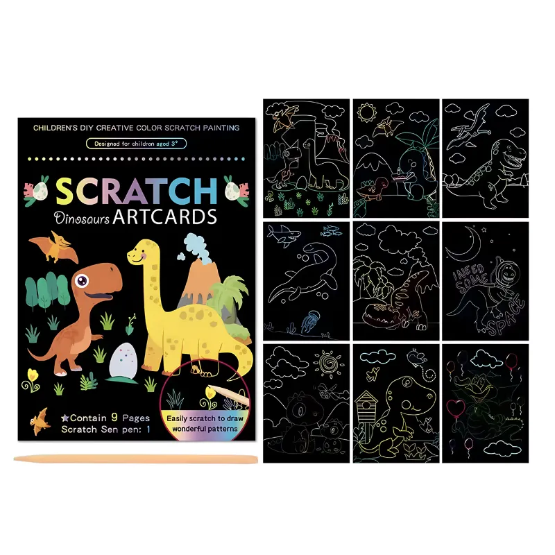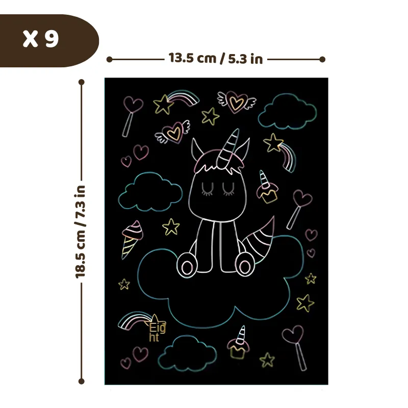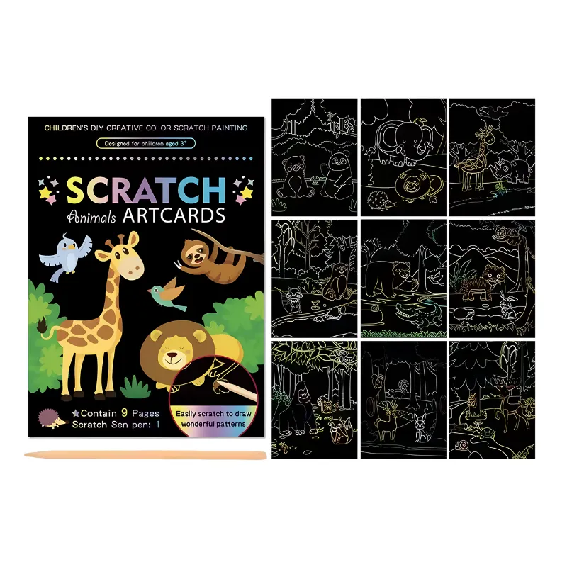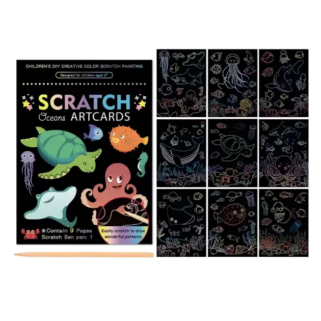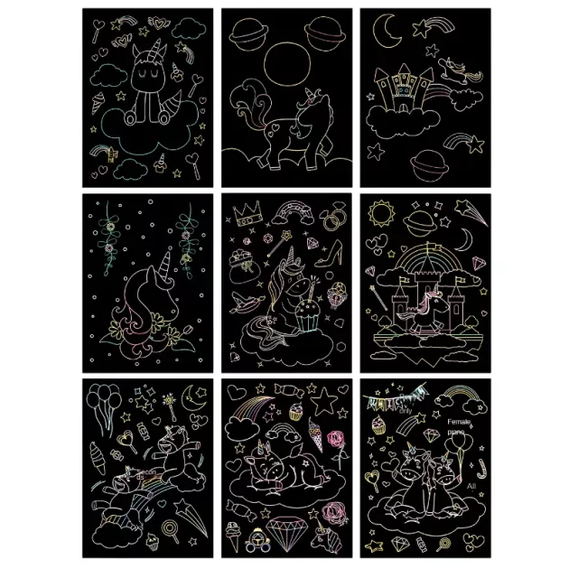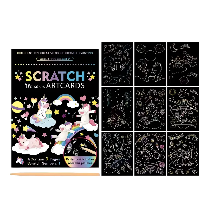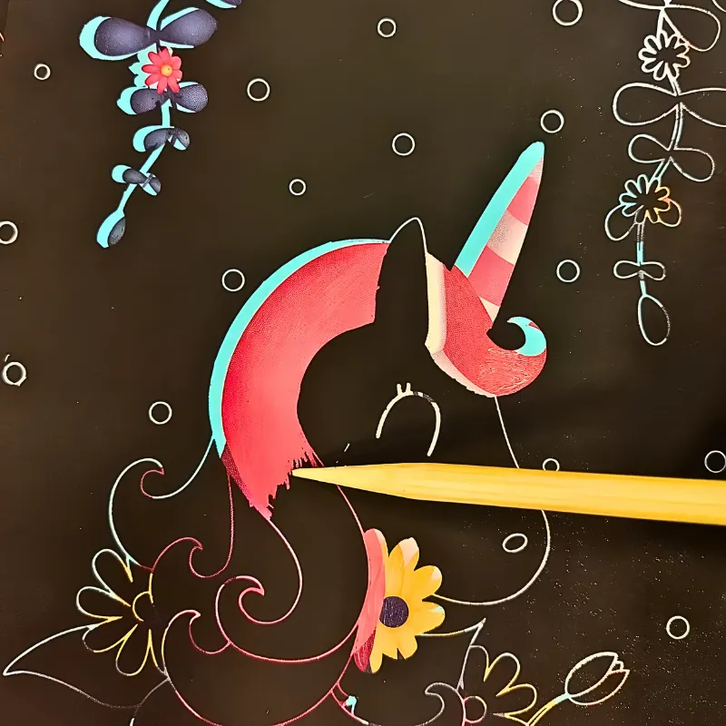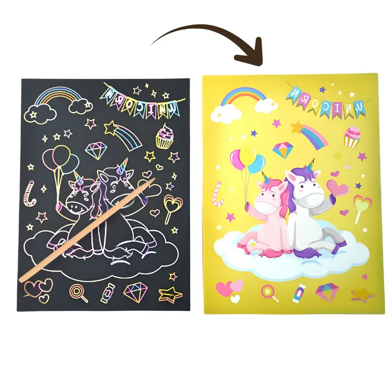 Zie creativiteit opbloeien terwijl elk vel heldere kleuren onthult. Magische ontwerpen verschijnen bij elke kras, waardoor kinderen geboeid blijven. Prachtige gloei-effecten veranderen elk kunstwerk in een uniek meesterwerk.