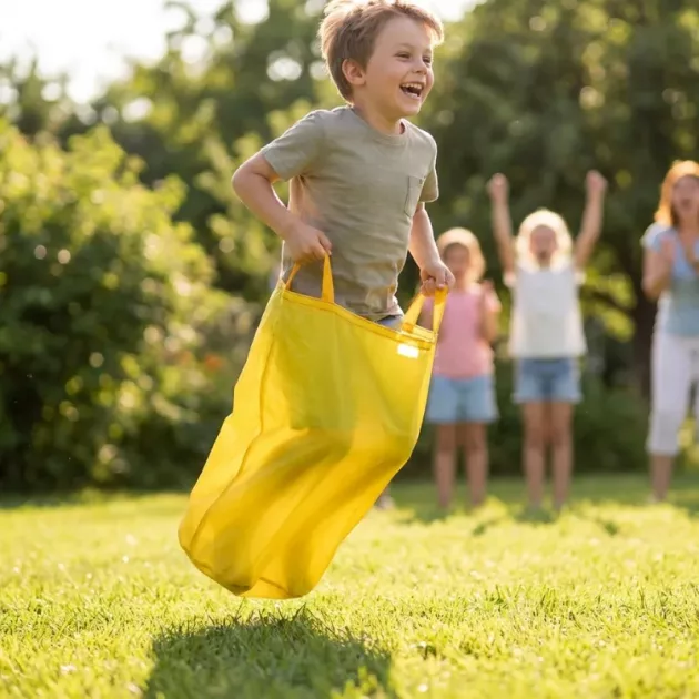 We gebruikten de zak op een schoolfeest. Kinderen verzonnen teamnamen, moedigden elkaar aan en mijn dochter liet trots haar nieuwe springvaardigheden aan opa en oma zien.