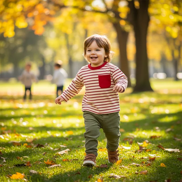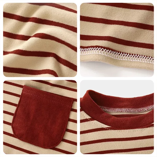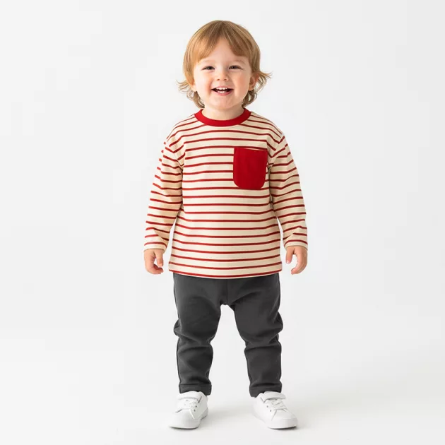 Het gestreepte shirt is de favoriet van mijn zoon voor buitenspelen. Het houdt hem warm, en hij vindt het zakje geweldig voor zijn kleine speelgoed.