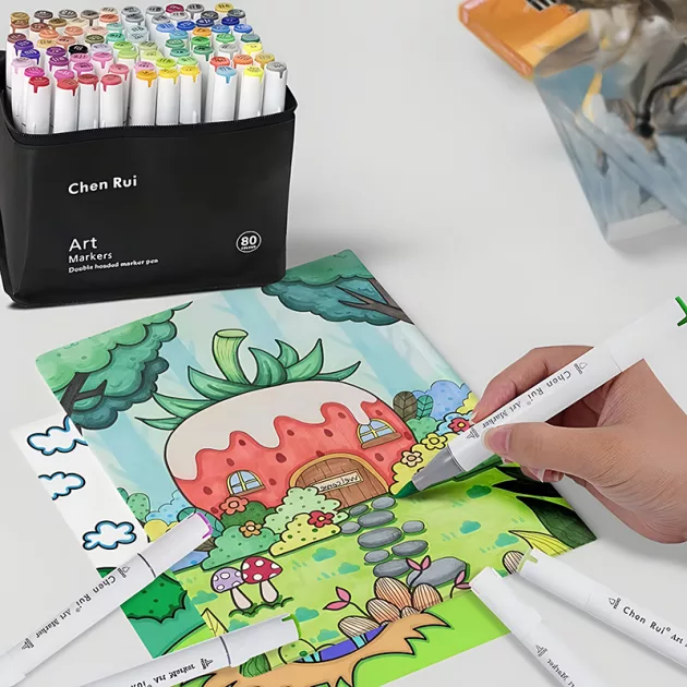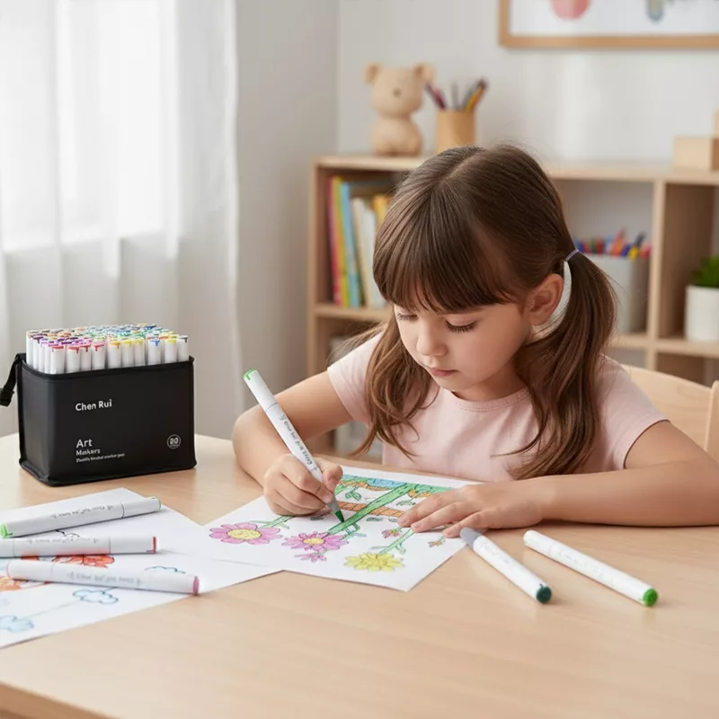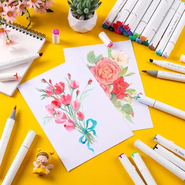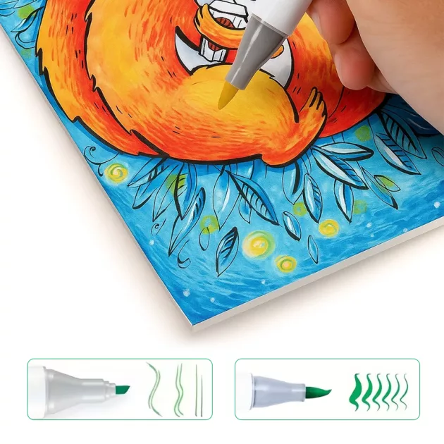 Deze stiften zijn geweldig—mijn schetsboek staat vol met gedurfde, felle tekeningen. Ik gebruik beide punten vaak en ze drukken nooit door het papier heen.