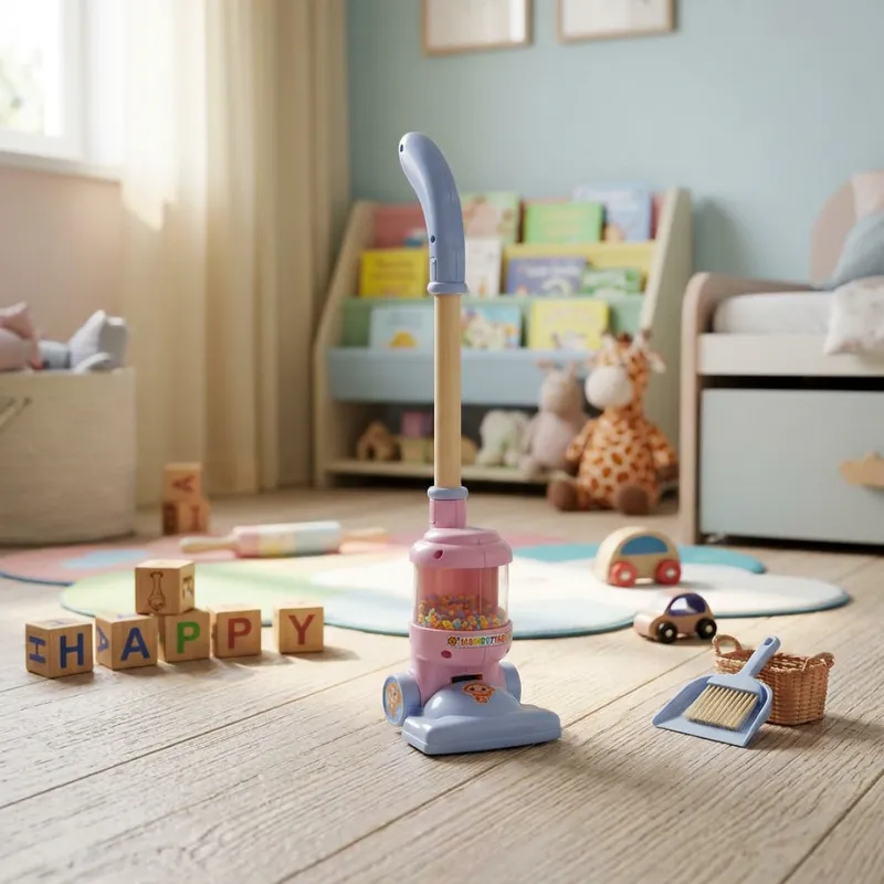Mijn kleuter laat hem vol trots aan neefjes en nichtjes zien, zodat ze samen een klein schoonmaakteam vormen. Ze giechelen, wisselen af en maken de speelkamer echt samen af.