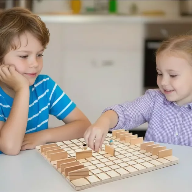 Ons gezin speelt dit corridorspel graag na het avondeten. De houten stukken voelen glad en veilig aan, en we eindigen altijd lachend samen.